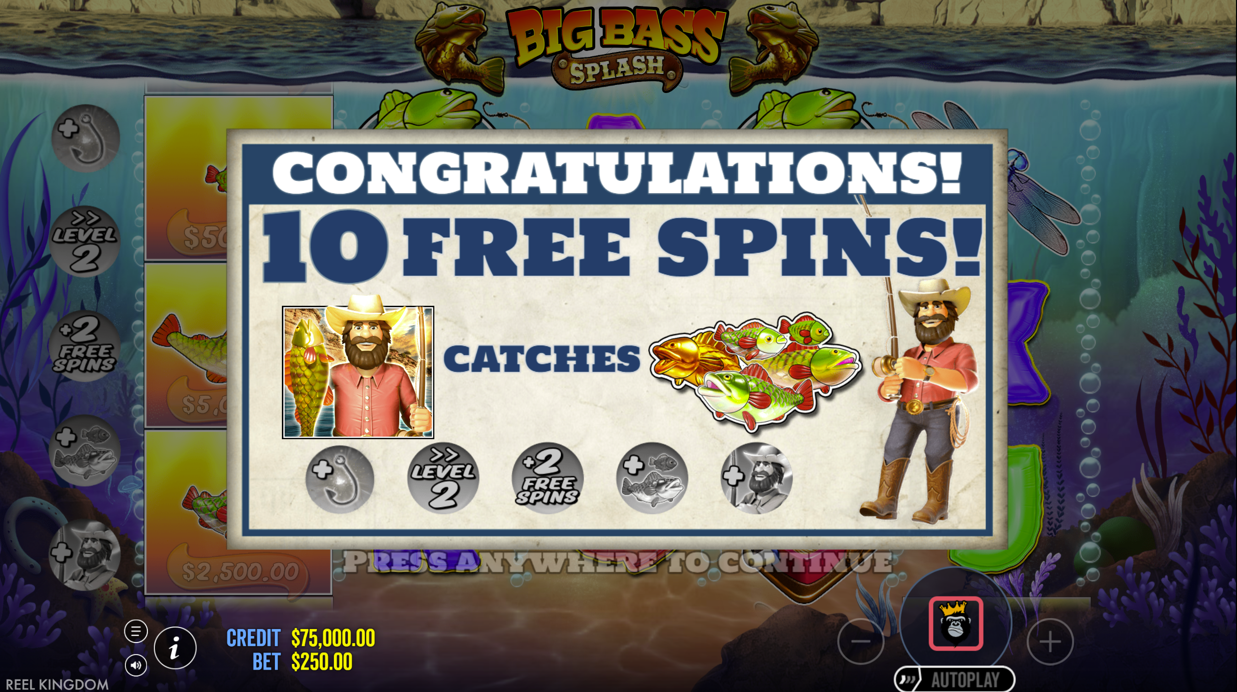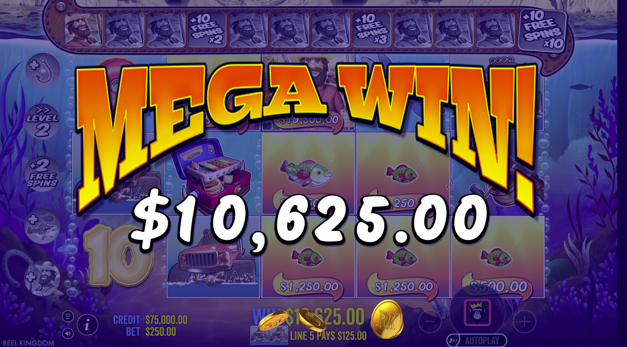 - Collect Symbols: Fisherman symbols collect values from money fish symbols, adding to both instant cash prizes and the multiplier.